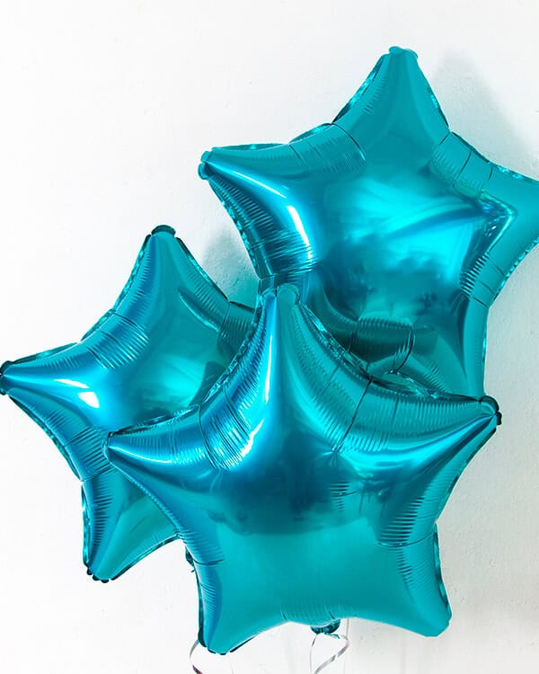 Фольгированные бирюзовые шары напоминают тонированный метал. Чтобы воздушные шарики в этом случае подошли под конкретное событие, можно выбрать нестандартную форму, изделия в виде цифр или букв.